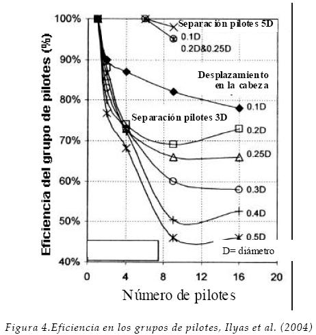 Pruebas realizadas en modelos de pilotes en grupos de 2, 4, 9 y 16 (Ilyas et al., 2004) mostraron que la eficiencia de los grupos depende del nivel de desplazamiento alcanzado, de la separación entre pilotes y del número de pilotes en el grupo. La eficiencia η la definieron como la carga lateral promedio del grupo dividido por la carga de un pilote aislado cuando tienen el mismo desplazamiento. Con separaciones centro a centro equivalentes a 3 diámetros, η disminuye bruscamente de 100% para el pilote aislado a poco menos de 50% para grupos de 9 pilotes, considerando un desplazamiento de medio diámetro (Figura 4). Al parecer, la eficiencia tiende a un límite de 50% y se mantiene constante para grupos con 9 o más pilotes con separaciones de 3D. También podemos ver que η disminuye al aumentar el nivel de desplazamiento que tenga el grupo. Además, la eficiencia es mucho más alta cuando la separación entre pilotes es de 5D.