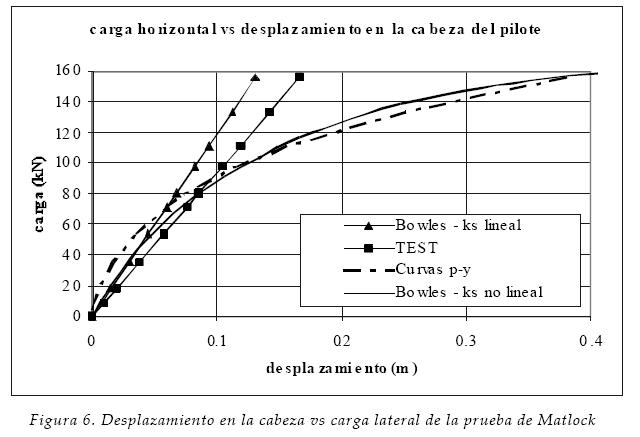 Para tomar en cuenta el comportamiento no lineal del suelo se programó un procedimiento iterativo que calcula el módulo de reacción ks en función de la deformación unitaria del suelo. En la figura 6 podemos ver los desplazamientos calculados con el programa de Bowles. Aunque falta verificar este procedimiento en más pruebas de carga, en la prueba de Matlock proporcionó una mejoría notable en comparación con los resultados conseguidos considerando ks como parámetro lineal.