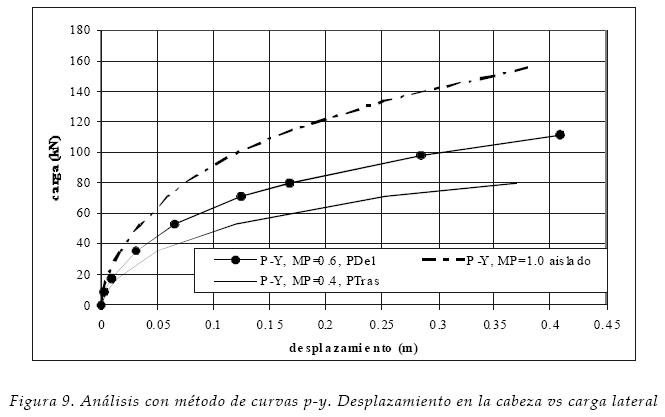 De los tres métodos empleados, el método de curvas py es el que mejor modela el comportamiento experimental, tanto en pilotes aislados como en grupos y la distribución de cargas que se presentan en estos. No obstante, debe cuidarse que la separación entre pilotes en el sentido perpendicular a la carga sea mayor o igual a la separación en la dirección paralela, para que el uso de multiplicadores de curvas py esté del lado seguro.