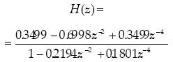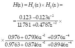 In order to transform the lowpass analog function (49) into the digital bandpass function, we proceed the sz transformation for each of these two transfer functions, we must first establish the coefficients ai,bi, for i = 0,1,2 for the first function H1(z) and then the coefficients ai, bi, for i=0,1,2,.. .,4 for the second one H2(z). This computation can be obtained using the matrix equations previously defined for current values: