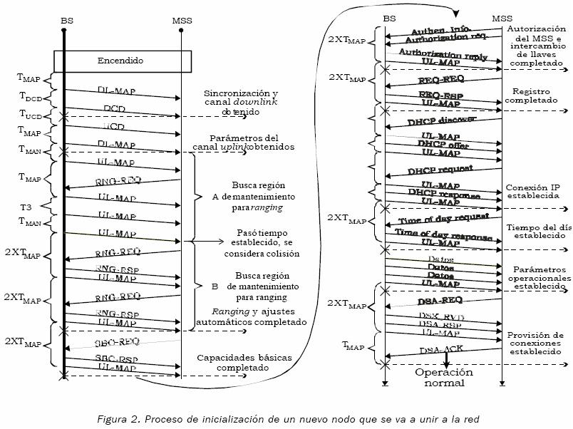 El proceso de inicialización mostrado en la figura 2, es llevado a cabo por todos los nodos que deseen entrar a la red por primera vez. La fase de ranging y ajuste automáticos es la más crítica para el proceso de HO, ya que es aquí donde el nodo envía el primer mensaje de registro hacia la BS, el cual deberá enviarlo en la región de contención. También es en esta fase donde se corrige el offset de tiempo y se ajusta la potencia de transmisión del nodo, para lo cual, numerosos mensajes entre el MSS y la BS pueden ser intercambiados. El tiempo que transcurre en la ejecución completa de esta fase es aleatorio. En la figura 2, se muestra el proceso de inicialización donde los retardos por inicialización pueden ir desde unos pocos segundos hasta varios minutos, en el peor de los casos, como se describe en (Cota, 2005).