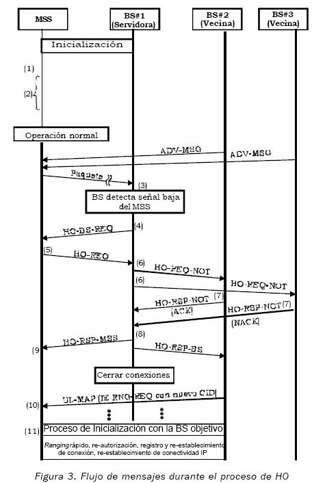 La BS vecina, que ha sido seleccionada como objetivo, empezará a asignar slots unicast para ranging (IEs), para el nuevo MSS que está en proceso de HO (10), con lo cual se evita la región de contención, que es la etapa que produce más del 90 % de los retardos en un HO como se indica en (Cota, 2000). Por otra parte, el MSS una vez que ha recibido el mensaje HORSPMSS, dejará de transmitir datos aunque tenga paquetes pendientes en la cola de espera. Si un paquete se genera en este momento, será trasladado hacia una cola especial mientras termina la parte crítica del cambio de conexión a la BS objetivo (BS2). Ahora el MSS cierra conexiones con la BS servidora y cambia las frecuencias tanto en su transmisor como en su receptor para sincronizarse nuevamente con la BS objetivo. Durante el proceso de inicialización con la BS objetivo (11), las etapas de "negociar capacidades básicas" y "autorización e intercambio de llaves" son ignoradas, ya que los parámetros que son intercambiados durante estas etapas ya han sido traspasadas entre la BS servidora y la BS objetivo mediante el mensaje HORSPBS. La etapa de "transferir parámetros adicionales" también es ignorada porque no se espera que estos parámetros cambien. La etapa de "tiempo del día" ya ha sido establecida durante el proceso de inicialización normal, por lo que no es necesario que se lleve a cabo otra vez. Las etapas de "registrarse con la BS" y "levantar las conexiones", debido a su naturaleza, deberán ser completadas rápidamente. Cuando el MSS está trabajando bajo el protocolo IP, necesita forzosamente ejecutar la fase "establecer conexión IP".