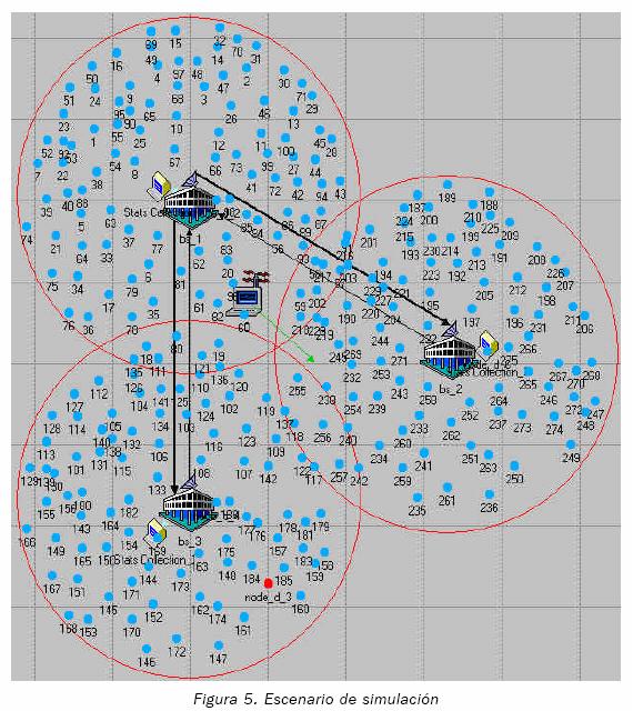 El escenario utilizado en las simulaciones, está formado por tres estaciones base de igual capacidad y de misma distancia de cobertura con una configuración tipo celular, como se aprecia en la figura 5. La cantidad de nodos que cada BS puede soportar, dependerá del tráfico que genere cada uno de ellos. Para la comunicación interBS se utilizaron enlaces duplex dedicados con una capacidad E1 (2048 kbps). Los parámetros utilizados durante las simulaciones se muestran en la tabla 2.