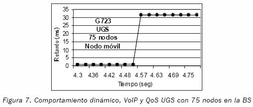 La figura 7 muestra el retardo de los paquetes cuando se utiliza VoIP con una QoS de UGS. La razón por la que se aprecia un aumento de aproximadamente 30 ms después de ejecutar el procedimiento de HO, es porque durante el cambio de conexión se le prohíbe transmitir al MSS. Sin embargo, éste sigue generando paquetes cada 30 ms por lo que después de ejecutar el cambio de conexión, el MSS tiene un paquete en el buffer, esperando ser transmitido, éste se desfasa un tiempo (igual al tiempo entre llegas de los frames de voz) como se aprecia en la figura 8. Para solucionar este problema, se proponen tres métodos: