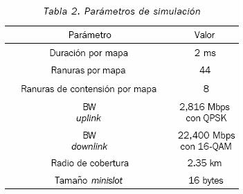 1) Tráfico Internet (IP). Para este tipo de tráfico se utilizó la distribución presentada en (Rangel, et al., 2001b) en donde la distribución de los mensajes es como sigue: Tramas de 64 bytes 60%, Tramas de 128 bytes 6%, Tramas de 256 bytes 4%, Tramas de 512 bytes 2%, 1024 Tramas 25% y Tramas de 1518 bytes 3%. La tasa de transmisión para este tipo de tráfico es de 38.4 kbps en la capa física (o 32 kbps en la capa IEEE 802.16 MAC) y es atendido con una QoS de BE; y