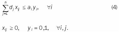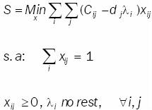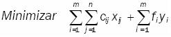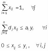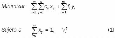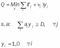 Sea el problema AD, en el cual un número finito m de vehículos disponibles distribuyen un solo tipo de producto, para atender la demanda de una cierta población de usuarios concentrada en n puntos discretos, cada uno con demanda dj , cuando un vehículo en particular es seleccionado, se incurre en un costo fijo fi por la utilización del vehículo i y un costo variable cij xij que está en función del costo unitario de viaje del vehículo i al destino j atendiendo la fracción xij de la demanda del cliente j. Asumiendo que la capacidad de cada vehículo es limitada, el problema consiste en decidir cuáles de los posibles vehículos serán utilizados, de tal manera que sus capacidades no sean excedidas y las demandas satisfechas; así como qué patrón de distribución deberá utilizar, tal que el costo total de establecer las unidades en servicio conformado por costos fijos más costos variables, sea minimizado en un horizonte finito de planeación. El problema AD se puede formular como sigue: