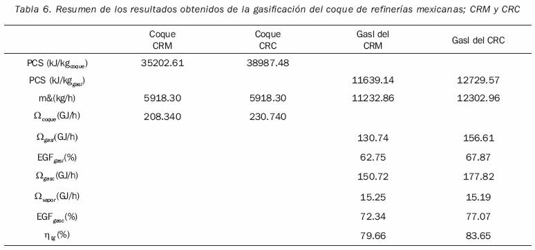 Considerando la potencia energética del gasl (Ωgasl) respectiva y la alimentación de coque al reactor de 5918.30 kg/h, se puede observar lo siguiente; cuando se gasifica el CRM se produce 22.09 MJ/kgcoque, mientras que cuando se gasifica el CRC se produce 26.46 MJ/kgcoque, con lo que es posible generar directamente desde el gasl producido 36.31 MW y 43.50 MW, respectivamente. Ambos resultados se obtuvieron con igual alimentación de coque (Tabla 6).