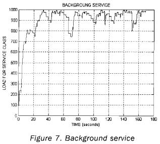 Several simulations were carried out where the great majority of these presented an efficiency value over 70%. Thus, from the graphic (see figure 5) that shows the admission control it is concluded that: the values of efficiency obtained are acceptable whenever they are maintained above the 70% of efficiency. In the following figures, the load behavior for the four classes of service is shown. Figure 7 shows the load for the background service class and as it was mentioned before, the most important characteristic to consider in this service class is to maintain the data integrity without considering the transmission delay. It is because of this that the load remains in high values, which indicates that the packet delivery is slow and in small quantities. It is necessary to observe that even when it seems that in some of the graphics the maximum possible value of the load is reached, this does not happen, since that would indicate packets loss by overflow of the buffer.
