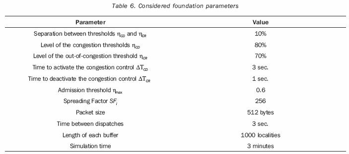 The figure 4 shows the load behavior before the congestion control strategy. As it is observed, the congestion control is being applied correctly according to the steps that it should be following with the specified load value in the buffers. What is important to consider in this graphic is the time that elapses between two states of congestion, since with the greater the time is, the better is the performance obtained. The time among congestion is defined as the time that elapses between two consecutive states in which the congestion control strategy operates. It is important to recall that the congestion control acts only when the load remains above the threshold ηCD a time ΔTCD. This is commented because as the figure shows the congestion control is not activated at every instant that the load surpasses the ηco threshold.
