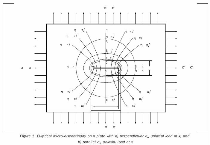 0. It should be noticed that the maximum stress at the tip of the micro discontinuity at the end of the ellipse major axis tends towards the infinite, without considering the magnitude of the σ0 applied stress, which shows that location takes place at the tip of the micro discontinuity for any load other than zero. When the σ0 applied stress is parallel to the major axis of the elliptical micro discontinuity, figure 1b, the ση maximum value on the micro discontinuity boundary is the extreme point of the minor axis, and