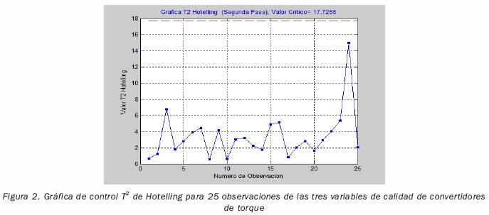 1. Si los datos del convertidor de torque, no normales, según la Prueba de HenzeZirkler, se monitorean mediante la Gráfica T2 de Hotelling se encuentra que ninguno de ellos se sale de control. Sin embargo, cuando se monitorean mediante la gráfica clasificación por rangos se encuentra que hay datos fuera de control. Entonces, se esperaría que los indicadores de calidad sean mejores cuando se calculan mediante el método de Hotelling, y los ingenieros de planta estarían cometiendo un error de estimación acerca del proceso.