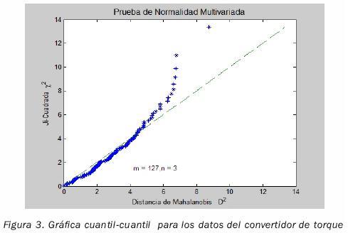 La cual se distribuye como una X2n(α), con n grados de libertad. Por esta razón, a esta gráfica se le conoce con el nombre de Gráfica cuantilcuantil o gráfica Jicuadrada (Koziol, 1993). En la figura 3, se muestra la gráfica en papel normal para los datos del convertidor de torque.
