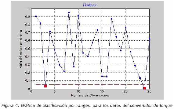 Si r(xi) se grafica por debajo del LCL, entonces la observación se declara fuera de control. Esto es una señal de alerta para los ingenieros del proceso. En la figura 4 se muestra la gráfica de clasificación por rangos para los datos del convertidor de torque.