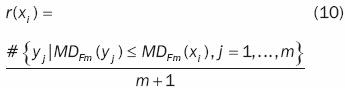 3. Sean X1 , X2,... las nuevas observaciones, las cuales se suponen siguen una distribución continua G. Para cada Xi se obtiene su profundidad, aplicando la ecuación (9), utilizando el vector de medias y la matriz de varianzascovarianzas, de Fm, las cuales se denotan mediante MDFm(xi) i=1,2,...