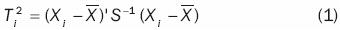 Por otra parte, en la Fase II se calcula el estadístico T2 de Hotelling para las mediciones actuales de las variables a controlar, X1, X2,... definido mediante la expresión: