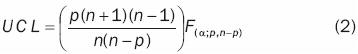 Se puede demostrar que, bajo la suposición de normalidad, T12 ,T22,... conforman una muestra aleatoria proveniente de una distribución F (Mason et al., 2002). Este resultado se utiliza, dada a, para fijar el límite de control en la Fase II, calculado como: