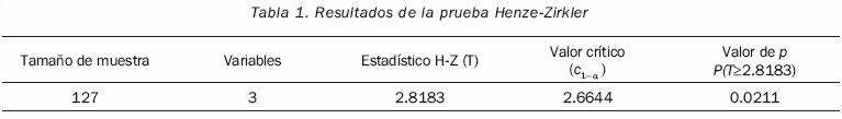 Una prueba estadística para determinar si un conjunto de datos sigue una distribución normal multivariada, conocida por su gran potencia, es la prueba de HenzeZirkler (Mecklin, 2004). Si x1, x2,..., xn denota una muestra aleatoria de una distribución p variada, entonces, el estadístico de la prueba de HenzeZirkler se define mediante la expresión (Henze et al., 1990):