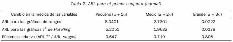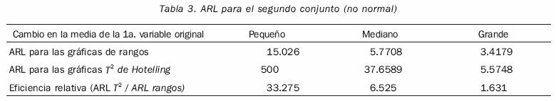 Las cinco variables del segundo conjunto de datos se generaron como sigue: La primera sigue una distribución uniforme en el intervalo [10,12]. Las cuatro restantes se generaron como una combinación de la primera y una variable uniforme [0,1]. Para cada conjunto de datos, se generó una distribución de referencia F de 300 observaciones. Después se generaron 500 nuevas observaciones para cada conjunto de datos, con diferentes cambios en los valores de las medias de las variables. Estas observaciones constituyen las distribuciones de monitoreo G. Las nuevas observaciones fueron monitoreadas mediante la gráfica T2 de Hotelling, y la carta de clasificación por rangos, con un α=0.05. Para comparar la eficiencia relativa entre los dos métodos se usó la longitud promedio de corridas (ARL). Ésta se define como el promedio de puntos dentro de control antes de observar un punto fuera de control. El ARL fue calculado con 1,000 simulaciones para cada uno de los cambios en la distribución de monitoreo: pequeño, medio y grande. En las tablas 2 y 3 se presentan el ARL para cada caso y para cada tipo de gráfica.