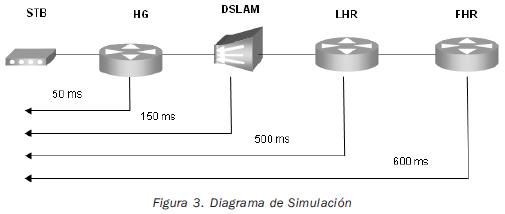 La simulación fue desarrollada en el software Matlab y se realizó en base al sistema mostrado en la figura 1. Los elementos en conjunto representan sólo una sección de un sistema para IPTV que da servicio a una gran cantidad de suscriptores. Cuando un STB cambie de canal se medirá el retardo en la adquisición de canal (Join latency) de acuerdo a la disponibilidad del canal deseado en los ruteadores; es decir, si el canal solicitado se encuentra disponible en el HG, el tiempo de adquisición será de 50 ms; si el mensaje de entrada al grupo tiene que viajar hasta el DSLAM, el tiempo será de 150 ms y si es hasta el LHR o FHR, será de 500 ms o 600 ms, respectivamente (Full ServiceVDSL, 2002) y (Cisco Systems, 2006b), (Figura 3).