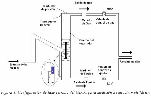 El esquema de un sistema de medición de flujo multifásico GLCC se muestra en la figura 1. El GLCC es un tubo instalado de forma vertical sin partes móviles o dispositivos internos, lo que constituye una gran ventaja de este tipo de sistemas. El GLCC es alimentado por una tubería ligeramente inclinada para promover la estratificación de las fases de la mezcla y obligar a una preseparación, esta tubería es acoplada en un costado del cuerpo del separador, una vez que la mezcla se encuentra en el interior del separador es expuesta a una combinación de fuerzas gravitacionales, centrífugas y de flotación, de esta forma, cuando el fluido rota, es expuesto a un campo de fuerzas centrífugas, la porción más densa de la mezcla (líquido) es forzada radialmente hacia la pared del cilindro, mientras que la porción más liviana (gas) permanece en el centro del remolino, posteriormente las fases son expuestas a fuerzas gravitacionales y de cuerpo, provocando que el líquido se recoja en el fondo del separador y el gas se extraiga por la parte superior. Para los propósitos de medición presentados en el trabajo, el GLCC tiene una configuración de lazo cerrado donde los flujos vuelven a combinarse para formar nuevamente la mezcla, como se muestra en la figura 1.