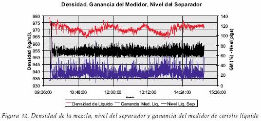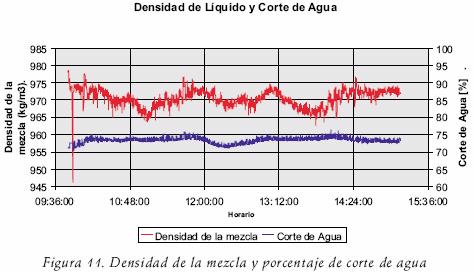 La figura 11, muestra la variación de la densidad de la fase líquida y el porcentaje de corte de agua contenido en la fase líquida. Estos dos parámetros junto con la determinación del gasto másico a través del medidor tipo Coriolis, permiten calcular el gasto volumétrico instantáneo para cada una de las fases líquidas a condiciones de operación tal como se muestra en las ecuaciones (7) a (9):