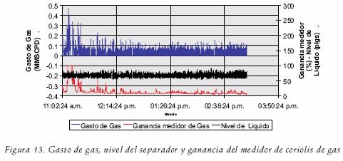 En las figuras 13 y 14 se muestra que la ganancia de los medidores de coriolis no llega a la saturación, indicando que la separación es exitosa para llevar a cabo una medición confiable, en este sentido, es importante enfatizar que la precisión en las mediciones de los aforos de pozos está supeditada a la precisión de los instrumentos de medición utilizados en el sistema, en este caso de ± 0.35% para la fase gaseosa y 1% para la fase líquida por parte de los medidores de coriolis y 1% para el medidor de corte de agua. Por esta razón, el desarrollo y aplicación de adecuadas estrategias de control para el sistema juegan un papel fundamental en la separación de las fases y por consecuencia la medición del flujo.