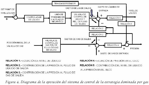 En los sistemas dominados por la fase líquida el control de nivel de líquido en el separador se realiza por medio de la válvula de control de flujo de gas, ya que la necesidad de desalojar una gran cantidad de líquido requiere de una gran apertura por parte de la válvula de control de flujo de líquido, situación que reduce el margen de maniobra y la imposibilidad para a justar con la suficiente rapidez el nivel del líquido. El manejo del nivel de líquido mediante la válvula de flujo de gas permite hacer ajustes más finos para el control de nivel de líquido. Para el caso de la estrategia de control para los sistemas dominados por la fase de gas, se utiliza preferentemente la válvula de control de flujo de líquido como elemento de control para estabilizar el nivel de líquido en el separador, debido al requerimiento de grandes cantidades de gas que exigirán una gran apertura por parte de la válvula de flujo de gas, reduciendo con esto el margen de maniobra de la válvula. En este caso, la válvula de control de líquido permite llevar a cabo un ajuste más fino para mantener el nivel de líquido en el punto adecuado.