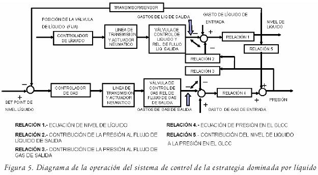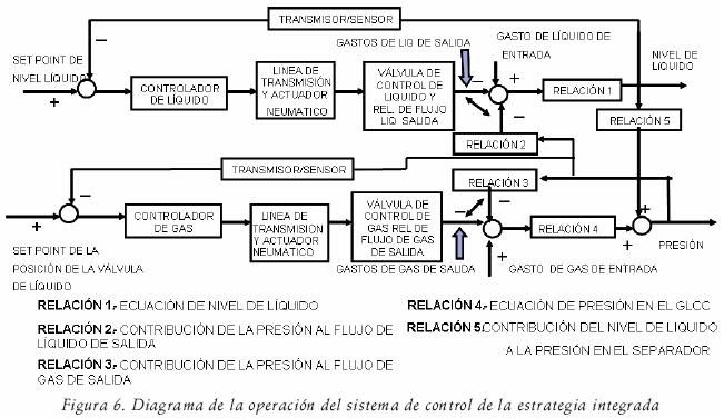 Los estudios señalan que el comportamiento del sistema de control del nivel de líquido por medio de la válvula LV102 y de presión por medio de las válvulas PV202 y PV203, mediante la estrategia de control integrada, es altamente deseable para condiciones de flujo slug. Esta estrategia hace operar al medidor GLCC a presión constante, de modo que el flujo del pozo no se restringe y simultáneamente contribuye a evitar el arrastre de líquido y de gas. En la figura 6, se muestra el diagrama de bloques que ilustra la operación de la estrategia de control integrada. Se observa en el esquema que las dos válvulas contribuyen al mantenimiento del nivel de líquido y de la presión en el separador.