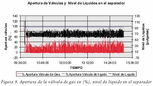 La figura 10, muestra las variaciones de presión que tienen lugar en el sistema durante el periodo de equilibrio del nivel de líquido en busca del valor de 70 pulgadas. Un requerimiento del sistema de medición es que la caída de presión a través del mismo no exceda de 14.7 psi, con la finalidad de evitar represionamiento al pozo y en consecuencia baja en la producción. Se observa en la figura que la diferencia entre la presión del separador y la presión de salida es muy inferior al valor límite de 14.7 psi, razón por la cual el sistema de medición cumple con este requerimiento.