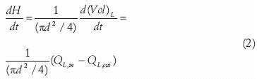 La razón de cambio del volumen de líquido en el separador está dada por el principio de conservación de masa y es la diferencia entre los flujos volumétricos de entrada (QL, in), y salida (QL, out ), del sistema, como la muestra la ecuación (1).