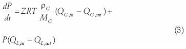 La razón de cambio en la presión P del separador está dada por las variaciones de presión de las fases de la mezcla, considerando que el gas tiene un comportamiento muy cercano al ideal y el líquido se considera incompresible, la variación temporal de la presión puede asociarse con la ecuación de estado del gas, como se muestra en la ecuación (3):