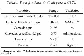 El sistema de medición de flujo multifásico de hidrocarburos fue desarrollado para el manejo de una amplía gama de condiciones de operación del Activo Integral Poza RicaAltamira, con la finalidad de utilizarlo en la medición de flujo de diferentes pozos propios del activo. Las condiciones de proceso son diferentes para cada pozo, entre los parámetros más significativos se encuentran: los flujos volumétricos, presiones y viscosidades. Bajo esta consideración el dimensionamiento del separador se llevó a acabo para las condiciones máximas y mínimas de operación del conjunto de pozos del Activo Integral Poza RicaAltamira. El separador fue fabricado en acero al carbón cédula 40, las dimensiones y las especificaciones de diseño se muestran en las tablas 1 y 2, respectivamente.