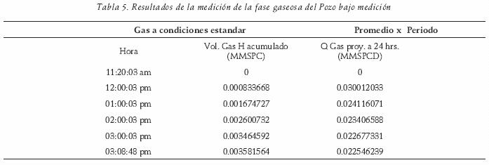 En la tabla 5, se muestran resultados de la medición del flujo volumétrico de la fase gaseosa del pozo. Los resultados de la medición se muestran en períodos de tiempo de una hora como se observa en la primera columna. En la segunda columna se muestra el volumen acumulado de la fase gaseosa a condiciones estándar, en la tercer columna se muestra el flujo volumétrico del gas en MMSPCD, determinado a partir del volumen acumulado y proyectado a 24 horas.
