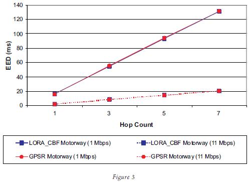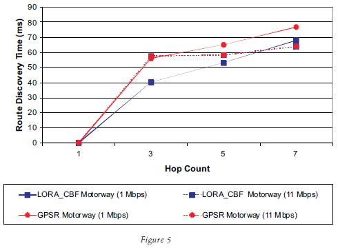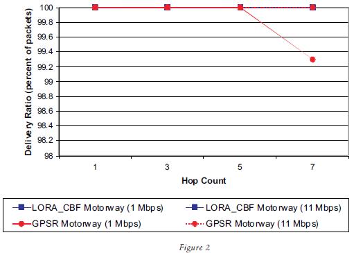 This section will compare a LocationBased Routing Algorithm with ClusterBased Flooding (LORACBF) we developed with a very popular positionbased routing algorithm called GPSR (Greedy Perimeter Stateless Routing). Results demonstrate that at an average speed of 42 m/s (150 km/h), the lack of a predictive algorithm and global knowledge position in GPSR significantly deteriorates its performance.