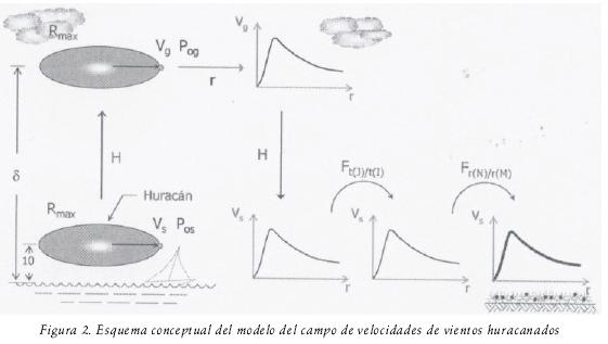 El objetivo principal de este trabajo es desarrollar un modelo del campo de velocidades de vientos huracanados y calibrarlo con registros de campo. El modelo desarrollado considera las principales variables que caracterizan a los huracanes (figura 1), tales como la velocidad superficial máxima Vsmax , el radio de velocidades máximas Rmax , la velocidad de traslación Vt , la presión central Po , la localización geográfica del ciclón (latitud y longitud), la relación entre velocidad superficial y velocidad a la altura gradiente H. Las expresiones empleadas para el cálculo de dichas variables están basadas en la literatura técnica reciente e incluyen los avances en el área de la meteorología. El modelo desarrollado se basa en el equilibrio de fuerzas a la altura gradiente y en el modelo propuesto por Holland en 1980. En la literatura técnica existen modelos que tienen bases teóricas similares al desarrollado en este trabajo, tales como el de SánchezSesma et al. (1988), Simiu y Scanlan (1996), Vickery et al. (2000) y Mounton et al. (2005); sin embargo, en esta investigación se propone un modelo desarrollado ad hoc para la Península de Yucatán, el cual esté debidamente calibrado.