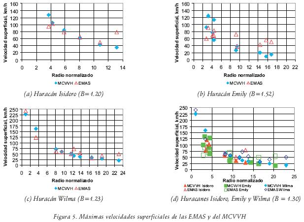 En la calibración del modelo se ajusta el parámetro B del perfil radial de presiones de Holland. En un primer análisis comparativo se asume un valor de B igual a uno en el MCVVH, el cual es un valor frecuentemente utilizado en la literatura técnica, y se compara con las mediciones de campo de las EMAS. Los resultados de este análisis se presentan en la figura 3, en la cual se grafican las máximas velocidades superficiales de las EMAS y del MCVVH en función del radio normalizado (Rn) para los huracanes Isidoro (2002), Emily (2005) y Wilma (2005). Se observa en esta figura que las máximas velocidades superficiales calculadas con el programa del MCVVH (marcadas con viñetas sólidas) son mayores que las velocidades medidas por las EMAS (marcadas con viñetas vacías) para la zona de mayor afectación contenida en una distancia radial de doce veces el radio normalizado.
