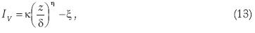 donde IV es el índice de turbulencia (adimensional) calculado con la ecuación (13) y asociado a una velocidad media (km/h) promediada, considerando el intervalo t(3600); κ, η y ξ son constantes (adimensionales) que dependen de la turbulencia y rugosidad del sitio; δ es la altura gradiente (metros).