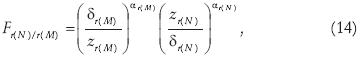 Calcular el factor de rugosidad Fr(N) / r(M) (adimensional) que permite cambiar de la categoría del terreno donde se localiza el huracán r(M) a la categoría del terreno del sitio de interés r(N) (Simiu y Scanlan, 1996; CFE, 1993), empleando la ecuación: