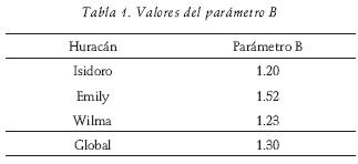 La calibración del MCVVH se realiza por medio del ajuste del valor del parámetro B, para lo cual se emplea el método de mínimos cuadrados. En la tabla 1 se presentan los resultados del ajuste del parámetro B para los huracanes Isidoro, Emily y Wilma, considerando los datos de los huracanes de manera individual y de manera agrupada (global). El ajuste global del valor del parámetro B es de 1.3 para los tres huracanes analizados. En esta tabla se puede observar que el ajuste individual del parámetro B para los distintos huracanes analizados arroja valores diferentes.