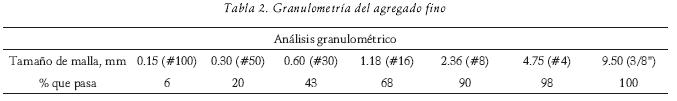 Se utilizó agregado fino calizo de la región, cuyas propiedades físicas y distribución granulométrica son presentadas en las tablas 1 y 2, respectivamente. Con el objetivo de eliminar la influencia de la distribución de partículas del agregado fino, se utilizó una graduación intermedia entre los límites superior e inferior especificados por la ASTM C 3303.