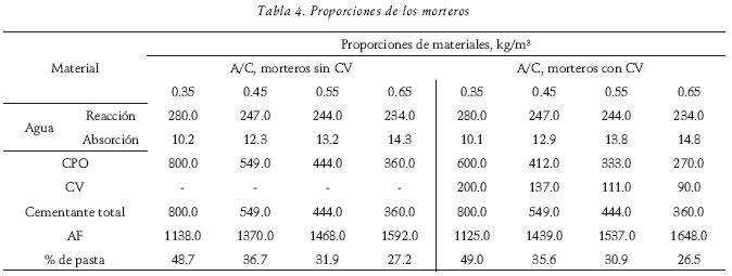 Lo anterior dio como resultado un total de ocho mezclas de mortero (4 sin CV y 4 con CV). Las proporciones de los materiales utilizados se muestran en la tabla 4.
