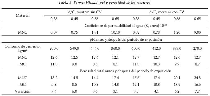 En la tabla 6 se presentan los resultados de los análisis de pH, para los MNC y MC con y sin ceniza. En ella se puede observar que, para los MC, el pH de la matriz tiende a disminuir conforme se incrementa la relación A/C. Lo anterior, debido a las diferencias de los consumos de cemento, ya que en el caso de morteros con relaciones A/C altas (0.65) el consumo de cemento es menor, razón por la cual existiría una menor cantidad de hidróxidos generada. Asimismo, las relaciones A/C altas permiten una estructura de la red de poros más abierta, facilitan do con ello el ingreso y la difusión del CO2, propiciando el avance de la carbonatación. Sin embargo, al comparar los valores de pH obtenidos al final del periodo de exposición, para los morteros con ceniza, el pH al canza valores mayores para casi todas las relaciones A/C, con excepción de los morteros con relación A/C de 0.35. Lo anterior podría indicar que, para un mismo tiempo de exposición, la disminución de la alcalinidad es menos significativa en los especímenes que contienen ceniza, comparados con aquellos especímenes fabricados sólo con CPO.