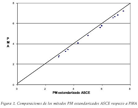 Estas diferencias se deben entre otras razones a que el método PM estandarizado ASCE, asumió un valor constante de resistencia superficial a la transferencia de vapor, rc= 70 sm1, mientras que el método patrón PMA tomó un valor rc=85.93 sm1, debido a que, en la primera ecuación se asumió un índice foliar LAI=24hc (Allen et al., 1998), mientras que con la segunda se siguió el criterio de la ASCE, donde LA I = (1.5)(LN (hc)1.4 (Jensen et al., 1990).