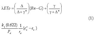 En las evaluaciones se encontró que la ecuación de PMA (ec. 1) proporcionó muy buenas estimaciones comparadas con el lisímetro, cuando se usa la resistencia aerodinámica y la resistencia de superficie tal como se presenta en el manual # 70 de la ASCE, para los casos particulares de la alfalfa (h=0.50 m) y pasto (h=0.12 m). Esta ecuación ha sido recomendada por este comité para estimar ETo y ser usada como método patrón para aquellos sitios en donde no se tengan datos de lisímetros. La ecuación de Penman Monteith ASCE es una expresión como la mostrada en (1) que se puede reescribir como (Walter et al., 2000):