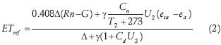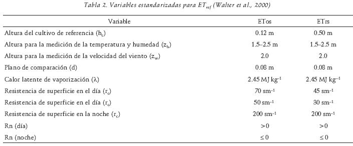 Walter et al. (2000) afirman que ambas características, tanto la estandarización de la ecuación como de los cultivos de referencia, proporcionan una mejor estimación horaria y diaria de ETo. La ecuación estandarizada propuesta por el comité de la ASCE, estima ETo para cultivos de referencia de talla baja (ETos) y para cultivos de referencia de talla alta (ETrs). Dicha ecuación estandarizada está acompañada de una tabla de valores para los cultivos de referencia. Tiene una constante en el numerador (Cn) que es una función del tiempo y de la resistencia aerodinámica; y otra en el denominador (Cd) que también es función del tiempo, de la resistencia superficial de la masa vegetal y de la resistencia aerodinámica (tablas 1 y 2). La ecuación propuesta es (Walter et al., 2000):