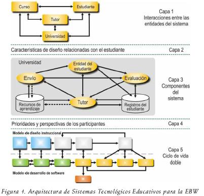 La arquitectura de sistemas tecnológicos educativos que se presenta, considera una gran parte de los elementos que intervienen dentro de un ambiente de EBW y pretende sentar las bases para los nuevos desarrollos de este tipo de sistemas. La producción de software educativo bajo esta arquitectura se caracteriza por su colaboración en el aprendizaje de los estudiantes. Básicamente, esta arquitectura presenta avances referentes al estudio de las interacciones entre las entidades del sistema, la incorporación de elementos pedagógicos que intervienen directamente en el aprendizaje de los estudiantes, la descomposición en componentes del sistema de aprendizaje y muestra una metodología para el desarrollo de sistemas de EBW, a través de un modelo de ciclo de vida doble. Estos avances son reflejados en la especificación de cinco capas que se describen en la siguiente figura 1.