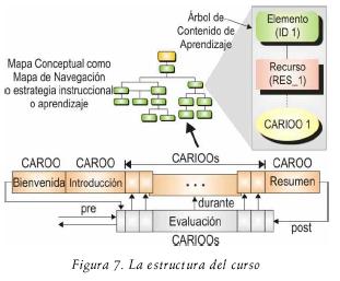 Basándose en los MC, el SiDeC representa la estructura del curso que el estudiante sigue. El proceso de entrega identifica un contenido de aprendizaje para el estudiante. El contenido de aprendizaje tiene un CARIOO asociado con él. Después, el proceso de entrega lanza el CARIOO y lo presenta al estudiante (figura 3). La figura 7 muestra cómo se organiza la estructura del curso y cómo el contenido de aprendizaje puede interpretarse dentro de un árbol de contenido de aprendizaje. Un árbol de contenido de aprendizaje es una estructura conceptual las actividades de aprendizaje administradas por el proceso de entrega de cada estudiante. Esta información se encuentra dentro del imsmanifest.xml que esta definido dentro del modelo de agregación de contenido de SCORM (ADL, 2004).