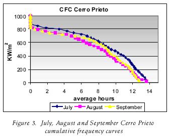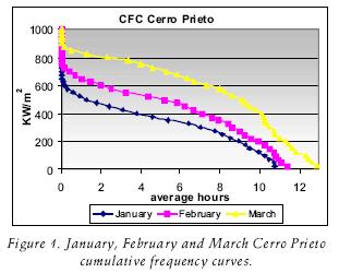 The CFC shows that the months with the greater number of hours at the highest levels of irradiance are the months of April to July and, at the other extreme, those of minor level are the months of November to January. With the use of these curves it is possible to observe in which month the greater steam production is possible. If a solar field of solar concentrators were used, this one would be the month of June and the one with the smaller production would be the month of January. The disadvantage of the CFC is that it is not possible to know with exactitude to the hour when the different levels of irradiance are obtained. The amount of energy is known in the number of hours' average permonth, but not in which moment these appear, which is important in an electrical generation plant when is required in detail. This can be done only in realtime if a pyrheliometer is available or, in the future, with satellite images, if a good methodology is available.