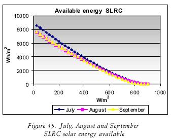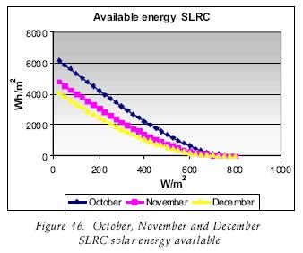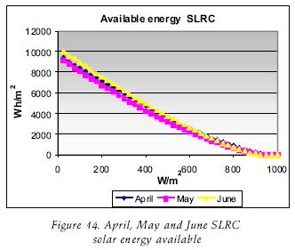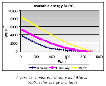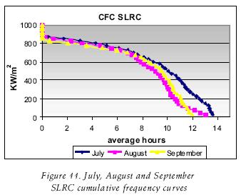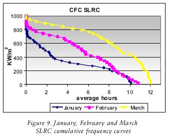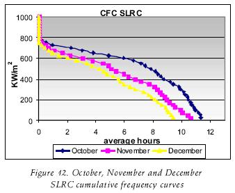 The CFC's are useful to consider them onthly production of a solar field. If it is required, it is possible to do them with greater detail, making a greater number of divisions at the intervals of the critical levels. The CFCs of June in CP and SLRC, which were observed over 800 W/m2 had six hours, implying that a concentrator will work with those levels or over if higher irradiance can be obtained during that number of hours. This implies that during this period the steam production can be obtained for that power or over this period if the irradiance is higher, depending on the area of the PTC solar field. If the equipment works over 400 W/m2, it will operate for around 11 hours. Following with another example now with the month of January, such equipment will only operate for around two hours over 400W/m2, not arriving at one hour over 800W/m2. In this case the division through out the year was made by month, but it can be made by an other form, for weeks or every 10 days throughout the year.