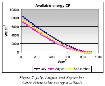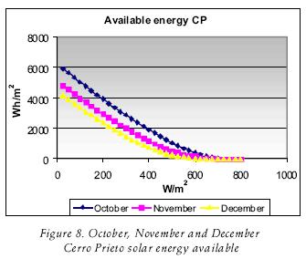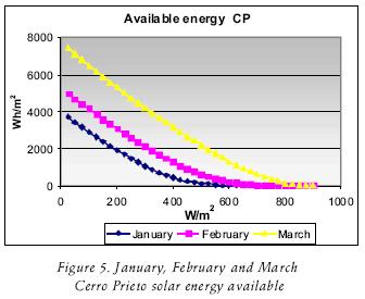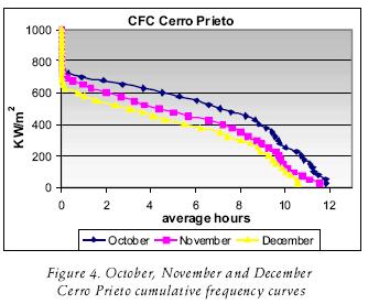 Next the Cerro Prieto cumulative frequency curves (figs. 1, 2, 3 and 4) are shown, which display the number of hours that, on average, are measured for different levels of irradiance in W/m2. Figures 5, 6, 7 and 8 show the solar energy available. In this case, the hours of direct irradiance registered in the geothermal Cerro Prieto field appear, taking into account the data from normal beam irradiance averaged from four years, and the value of the cosθ factor.